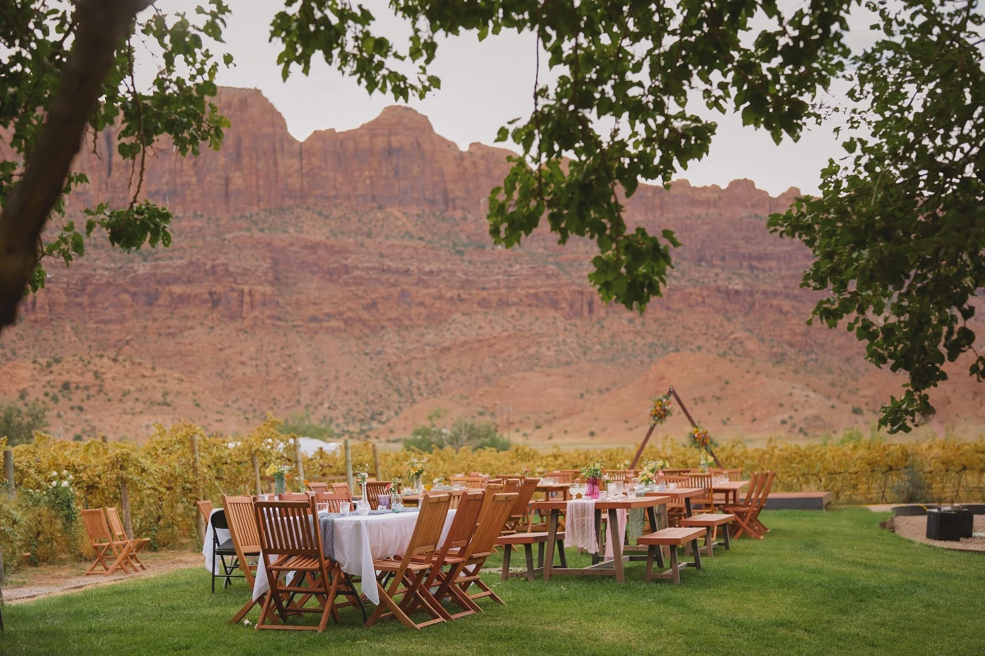A vineyard wedding venue in Moab, Utah surrounded by red rock and open sky.